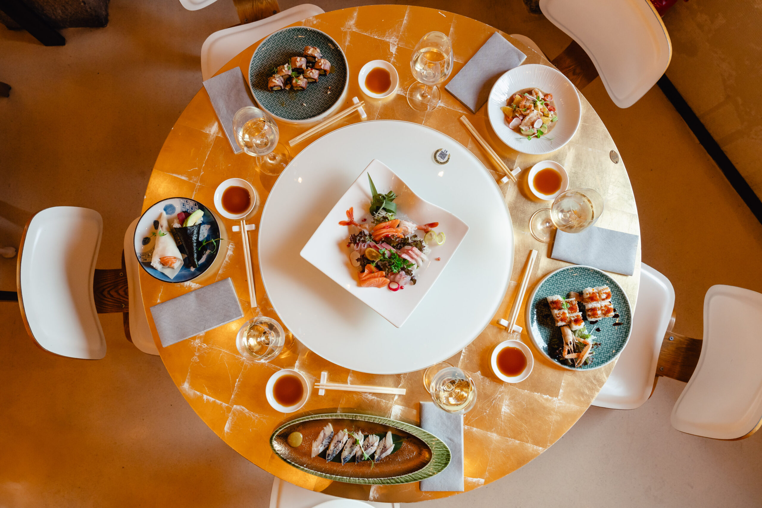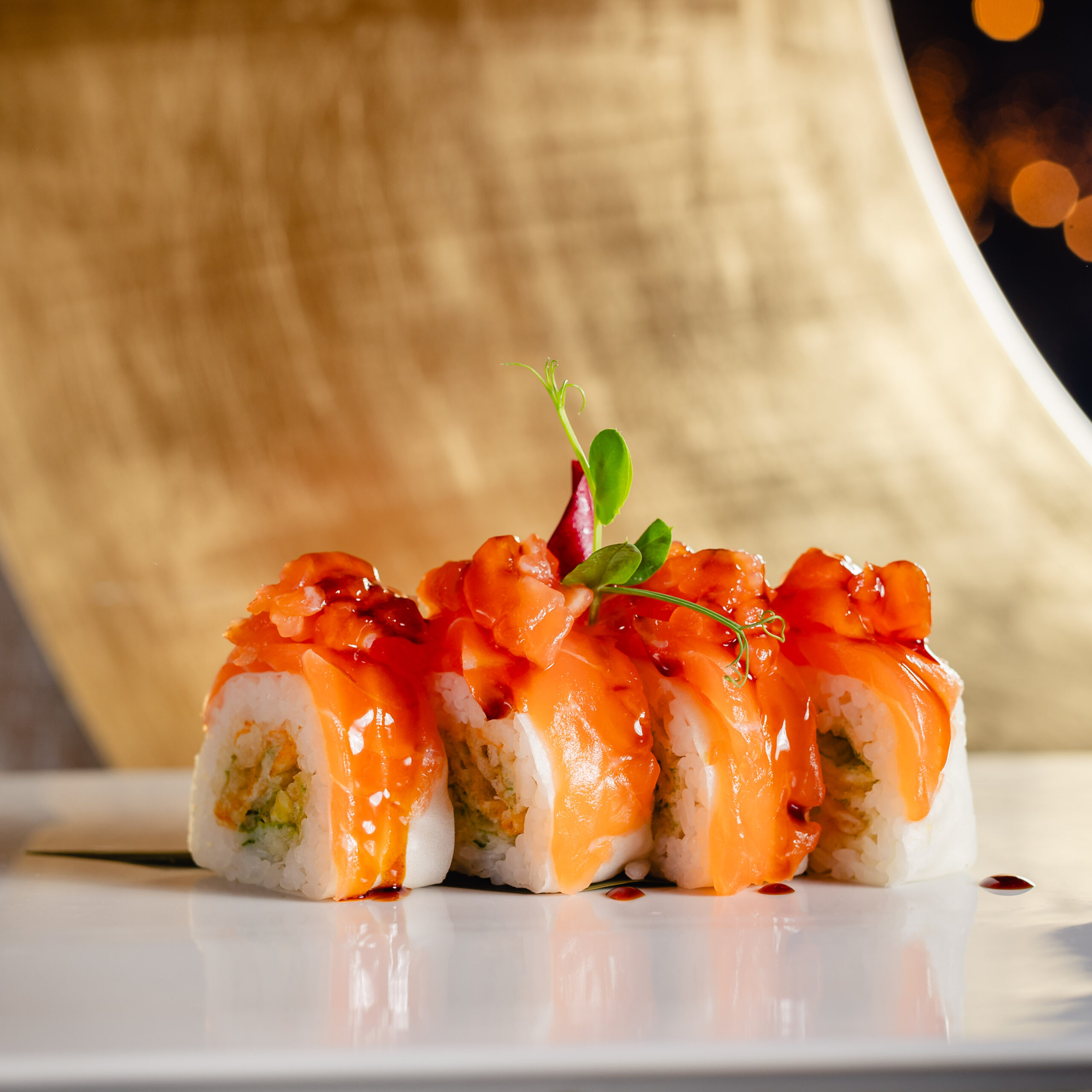 Una fusione di tessuti giapponesi tradizionali rivisitati nello stile Plein, teschi dorati scintillanti e pietra scura: il Sukaru Ba accoglie gli ospiti in un’atmosfera magica, dove maestri sushi preparano prelibatezze uniche e piatti firmati da Philipp Plein.
